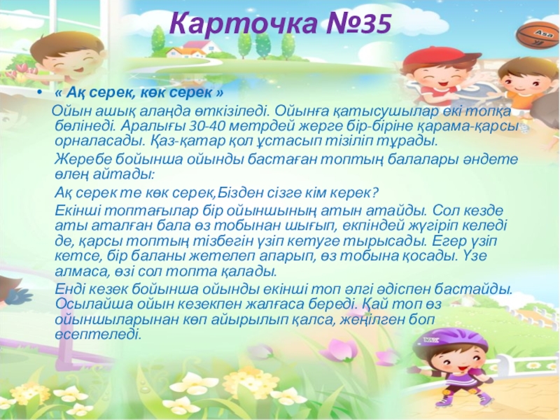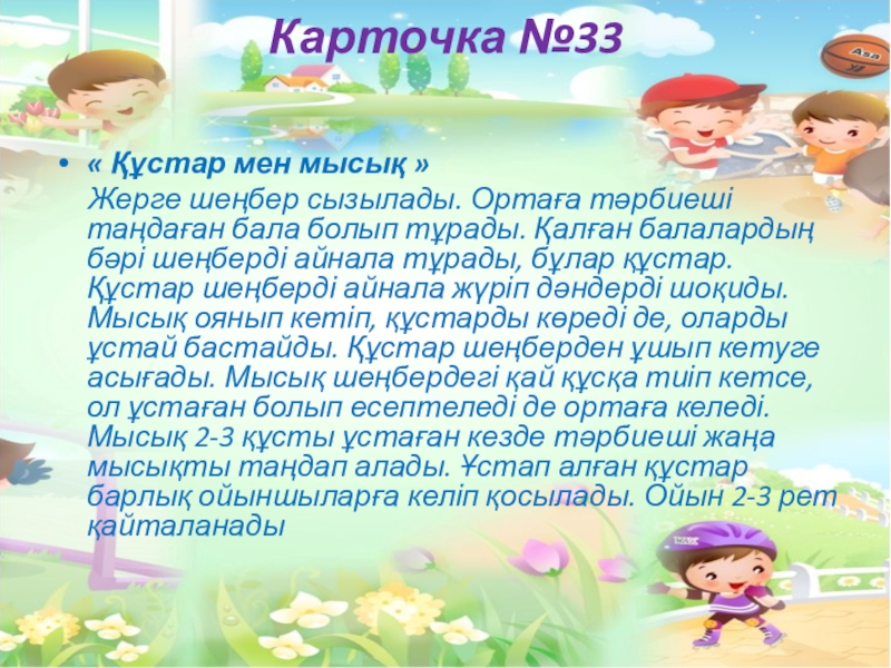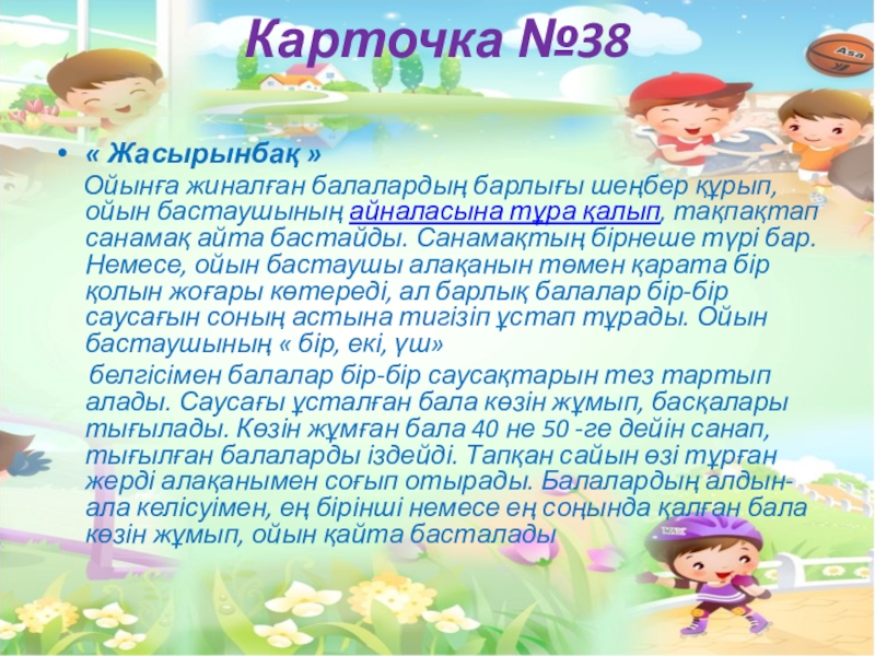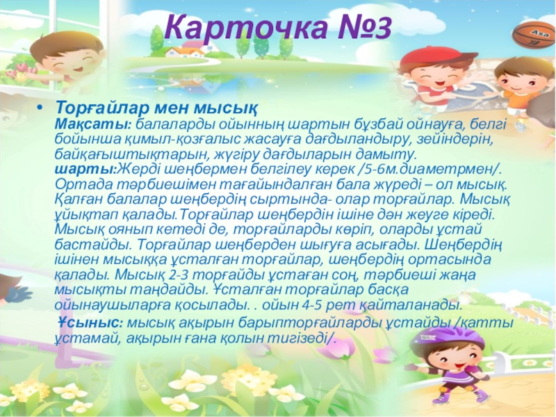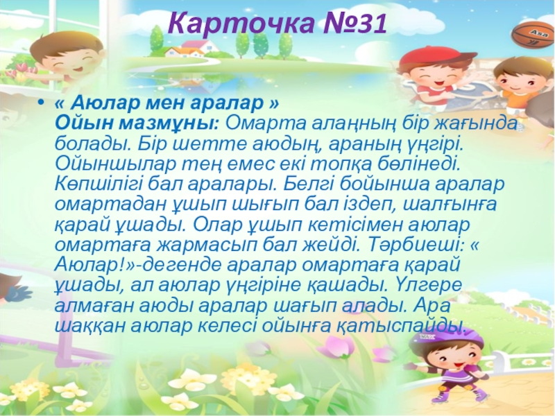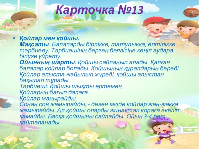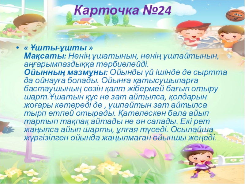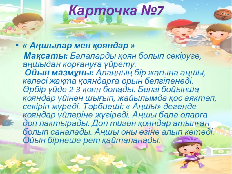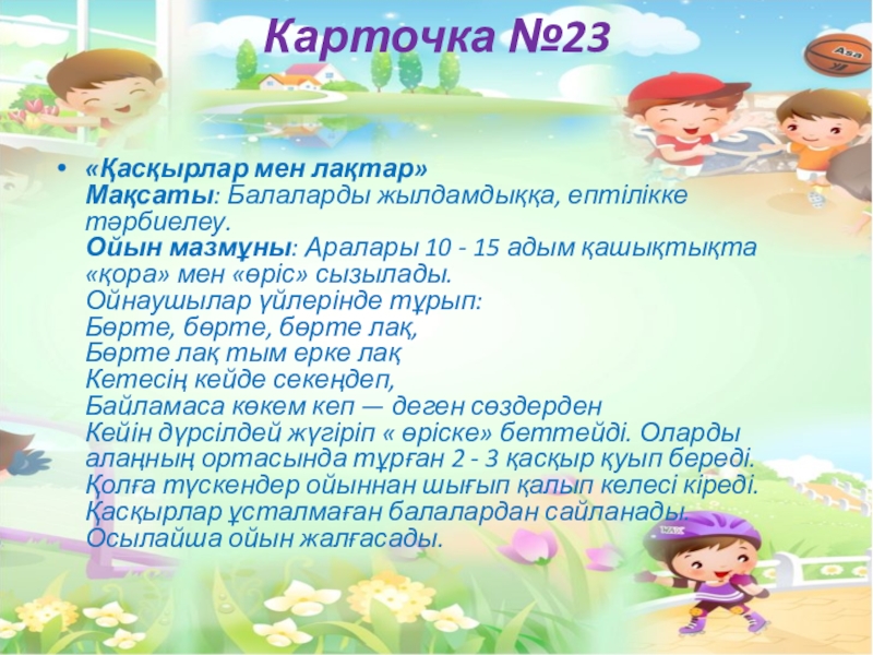 Мақсаты: Балаларды қырағылыққа, ептілікке және ойынды дұрыс ойнауға үйрету.
