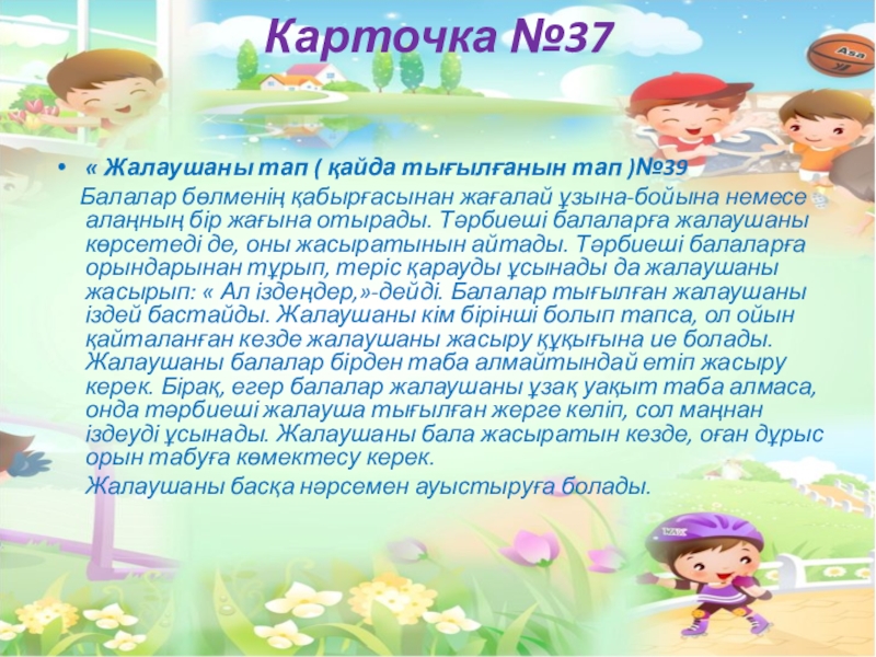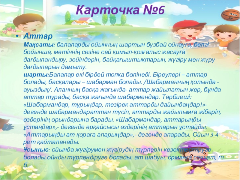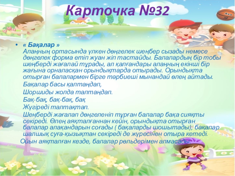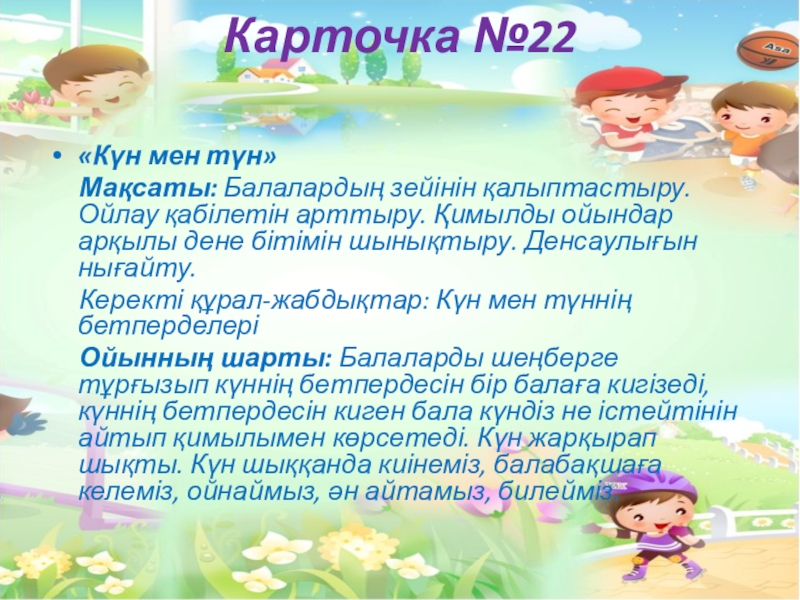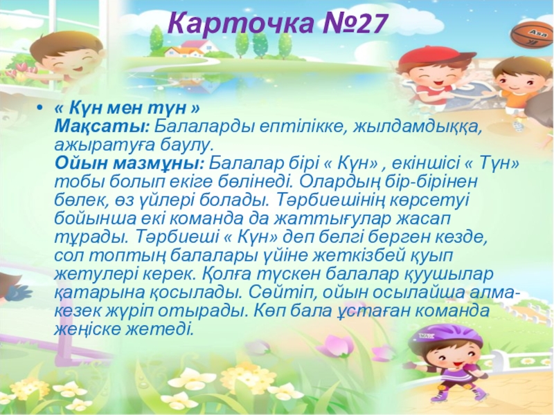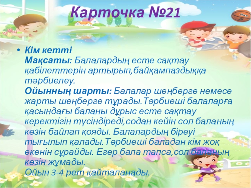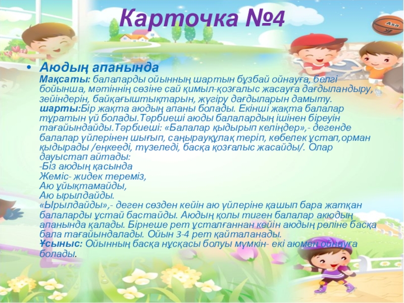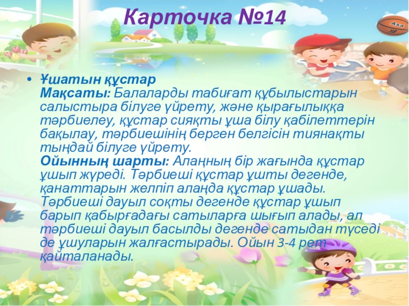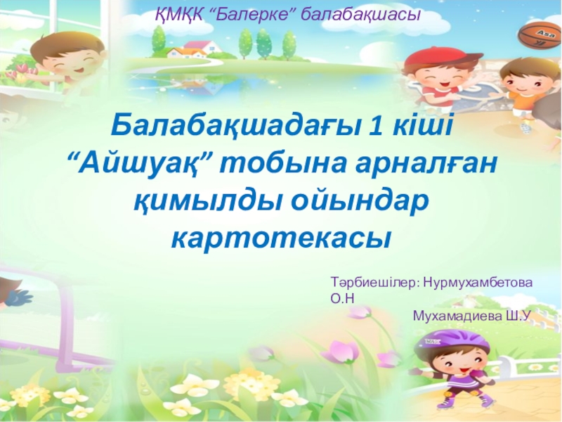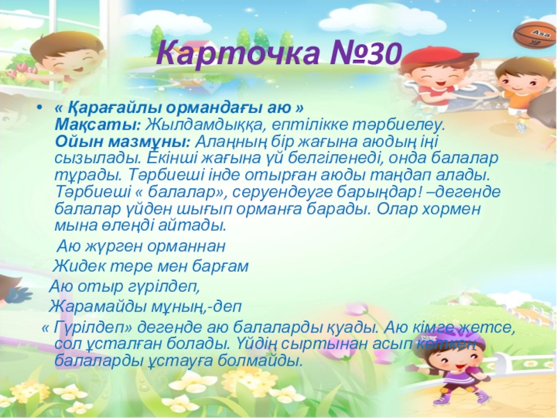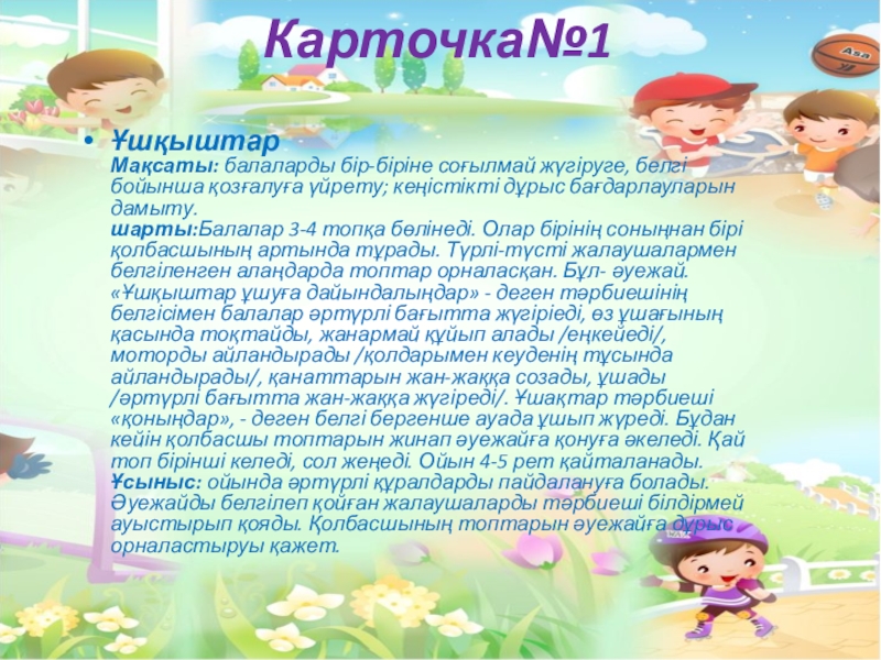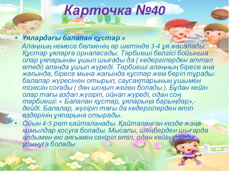 Слайд 41Балабақшадағы 1 кіші “Айшуақ” тобына арналған қимылды ойындар картотекасы