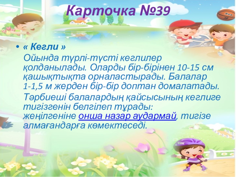 Тәрбиеші балалардың қайсысының кеглиге тигізгенін белгілеп тұрады: жеңілгеніне онша назар аудармай, тигізе алмағандарға көмектеседі.