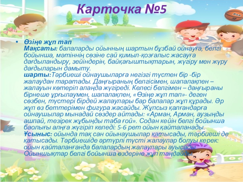 Мақсаты: Қимыл қозғалыс қабілеттерін арттыру, тілдерін дамыту, ептілікке тәрбиелеу.