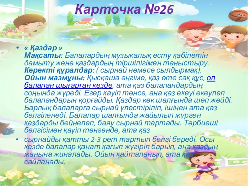 Мақсаты: Балалардың музыкалық есту қабілетін дамыту және қаздардың