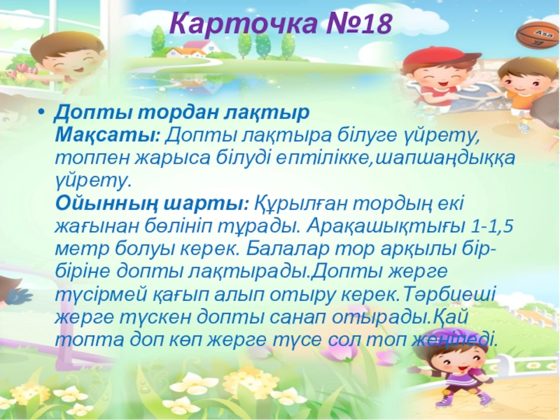 ережелерін сақтай білуге, топпен ойнауды ойнай білуге үйрету. Ептілікке,алғырлыққа тәрбиелеу.