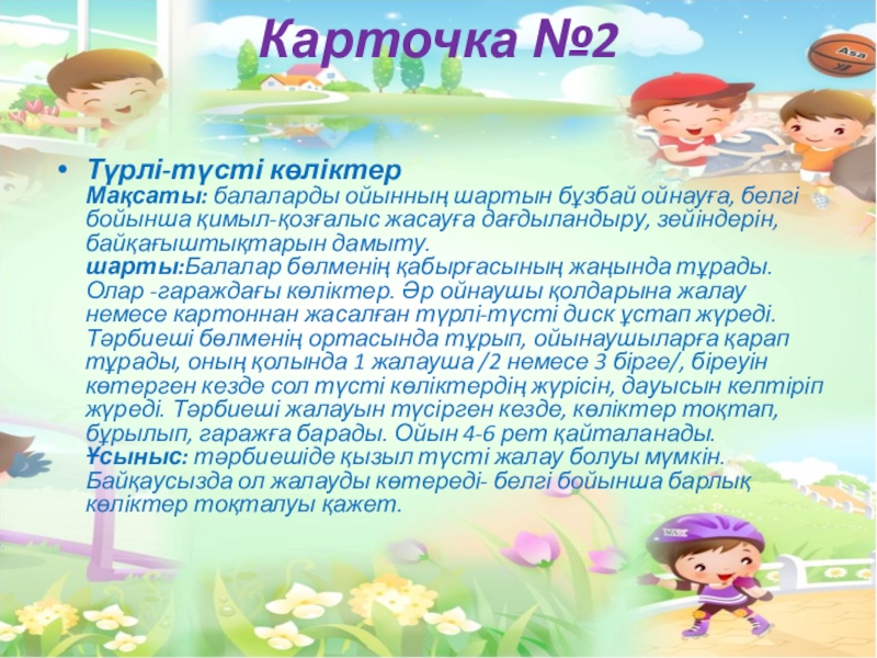 шарты:Балалар бөлменің қабырғасының жаңында тұрады. Олар -гараждағы көліктер. Әр ойнаушы қолдарына жалау немесе картоннан жасалған түрлі-түсті диск ұстап жүреді.Тәрбиеші бөлменің ортасында тұрып, ойынаушыларға қарап тұрады, оның қолында 1 жалауша /2 немесе 3 бірге/, біреуін көтерген кезде сол түсті көліктердің жүрісін, дауысын келтіріп жүреді. Тәрбиеші жалауын түсірген кезде, көліктер тоқтап, бұрылып, гаражға барады. Ойын 4-6 рет қайталанады.