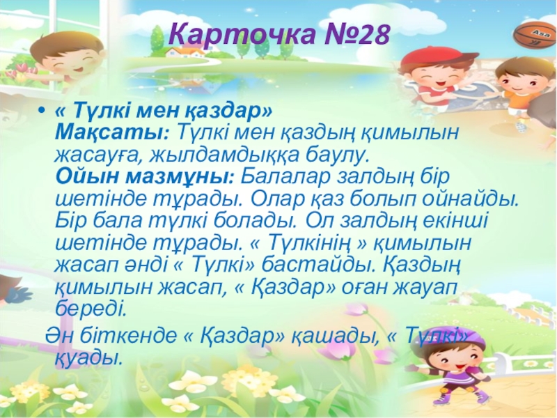 Мақсаты: Түлкі мен қаздың қимылын жасауға, жылдамдыққа баулу.