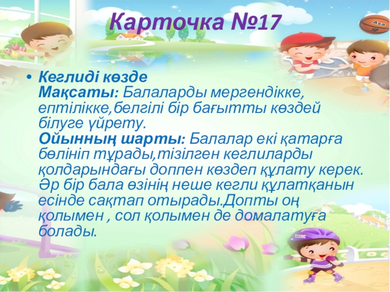 Мақсаты: Балаларды белгіленген бағыты көздей білуге,ептілікке,шапшаңдыққа үйрету.