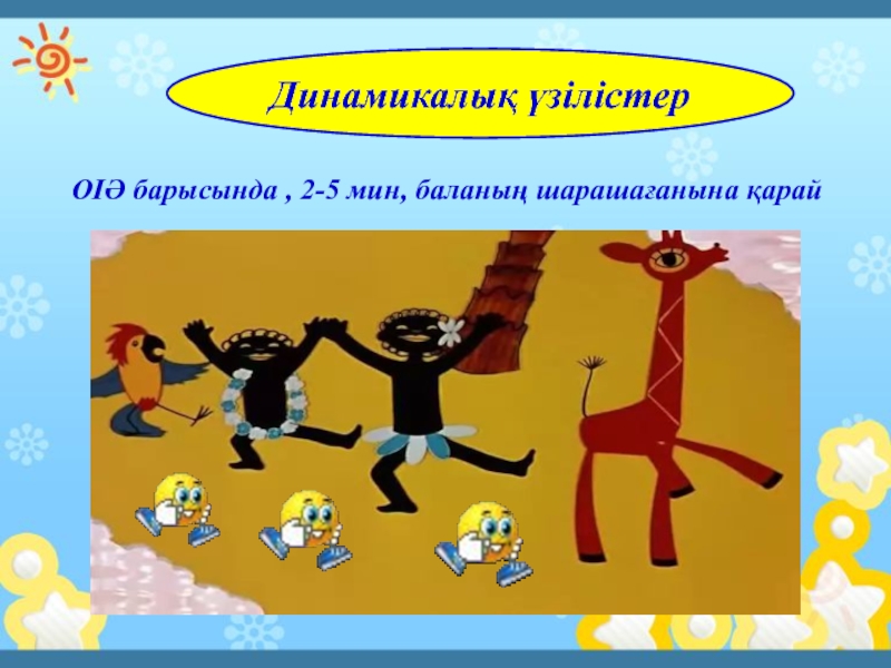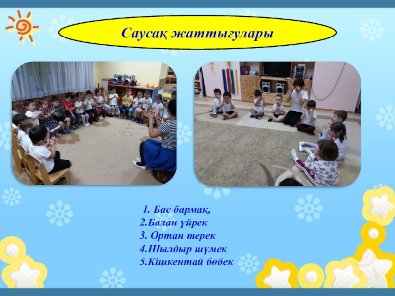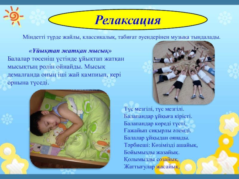 Балалар төсеніш үстінде ұйықтап жатқан мысықтың ролін ойнайды. Мысық демалғанда оның іші жай қампиып, кері орнына түседі.