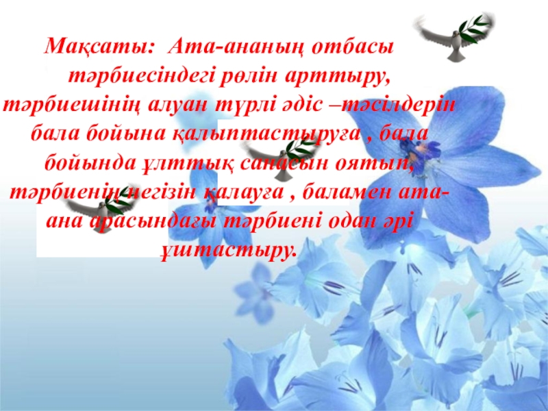 Слайд 2Мақсаты: Ата-ананың отбасы тәрбиесіндегі рөлін арттыру, тәрбиешінің алуан түрлі әдіс –тәсілдерін