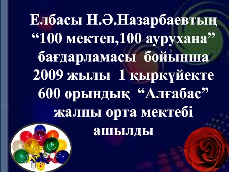 Слайд 2Елбасы Н.Ә.Назарбаевтың “100 мектеп,100 аурухана” бағдарламасы бойынша 2009 жылы 1 қыркүйекте