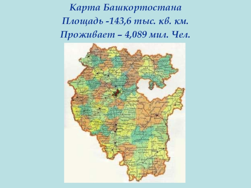 Карта БашкортостанаПлощадь -143,6 тыс. кв. км.Проживает – 4,089 мил. Чел.
