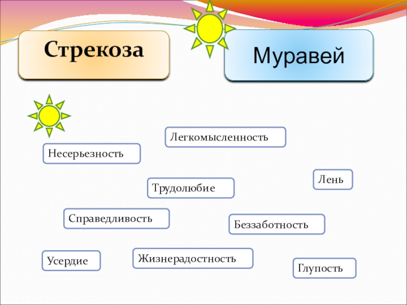 СтрекозаМуравейЛеньБеззаботностьСправедливостьУсердиеЛегкомысленностьНесерьезностьЖизнерадостностьТрудолюбие Глупость
