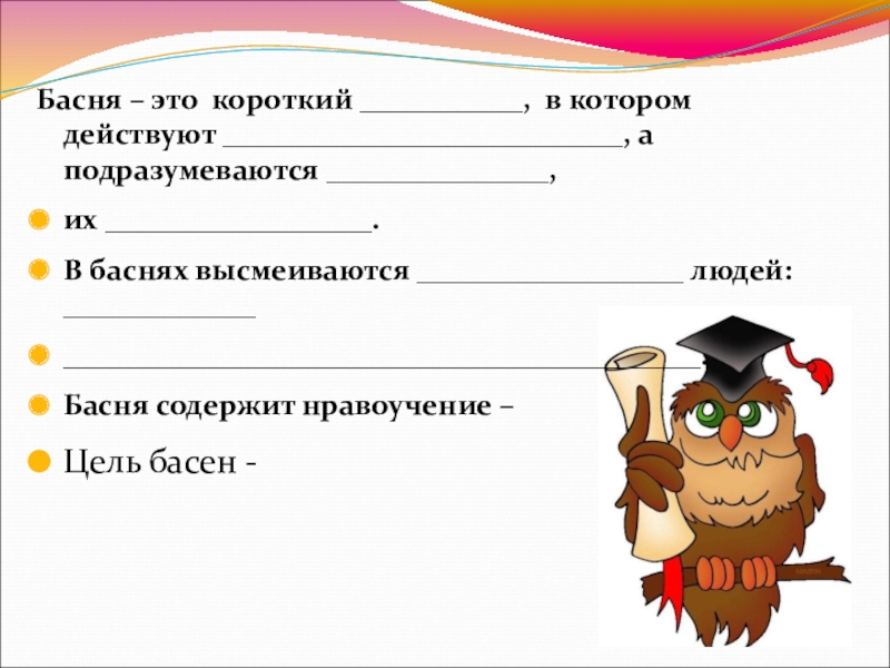 Слайд 2Басня – это короткий ___________, в котором действуют ___________________________, а подразумеваются