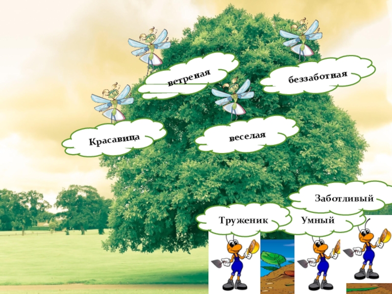 СтрекозаМуравейЛеньСправедливостьУсердиеЛегкомысленностьНесерьезностьЖизнерадостностьТрудолюбие ГлупостьБеззаботность