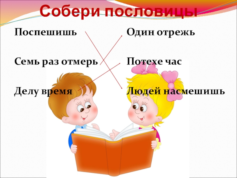 Собери пословицыПоспешишьСемь раз отмерьДелу времяОдин отрежьПотехе час Людей насмешишь