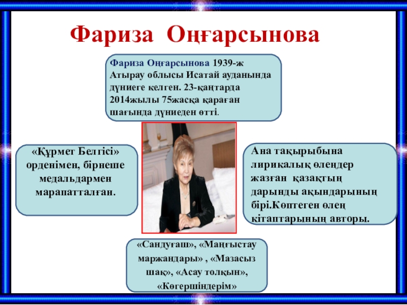 Фариза Оңғарсынова 1939-ж Атырау облысы Исатай ауданында дүниеге келген. 23-қаңтарда 2014жылы 75жасқа қараған шағында дүниеден өтті.