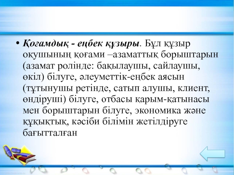 Слайд 14Қоғамдық - еңбек құзыры. Бұл құзыр оқушының қоғами –азаматтық борыштарын (азамат