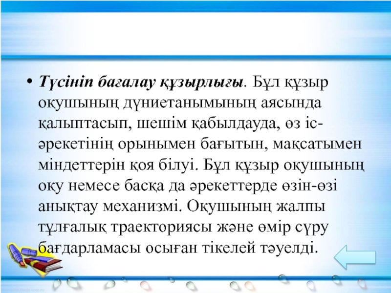 Слайд 11Түсініп бағалау құзырлығы. Бұл құзыр оқушының дүниетанымының аясында қалыптасып, шешім қабылдауда,