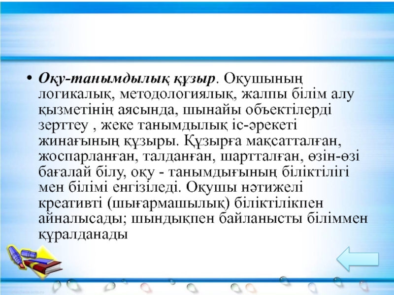 Слайд 10Оқу-танымдылық құзыр. Оқушының логикалық, методологиялық, жалпы білім алу қызметінің аясында, шынайы
