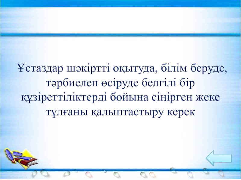 Слайд 5Ұстаздар шәкіртті оқытуда, білім беруде, тәрбиелеп өсіруде белгілі бір құзіреттіліктерді бойына