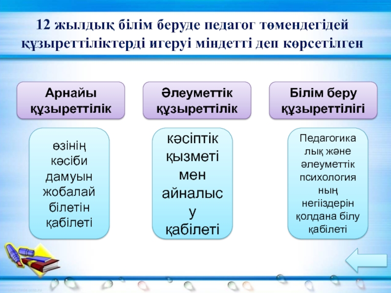 Слайд 312 жылдық білім беруде педагог төмендегідей құзыреттіліктерді игеруі міндетті деп көрсетілген