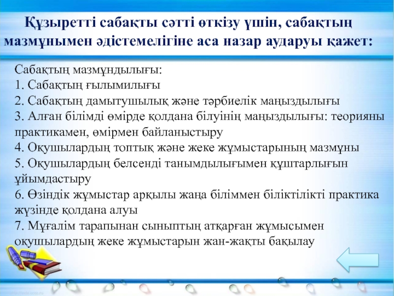 Слайд 17Құзыретті сабақты сәтті өткізу үшін, сабақтың мазмұнымен әдістемелігіне аса назар аударуы