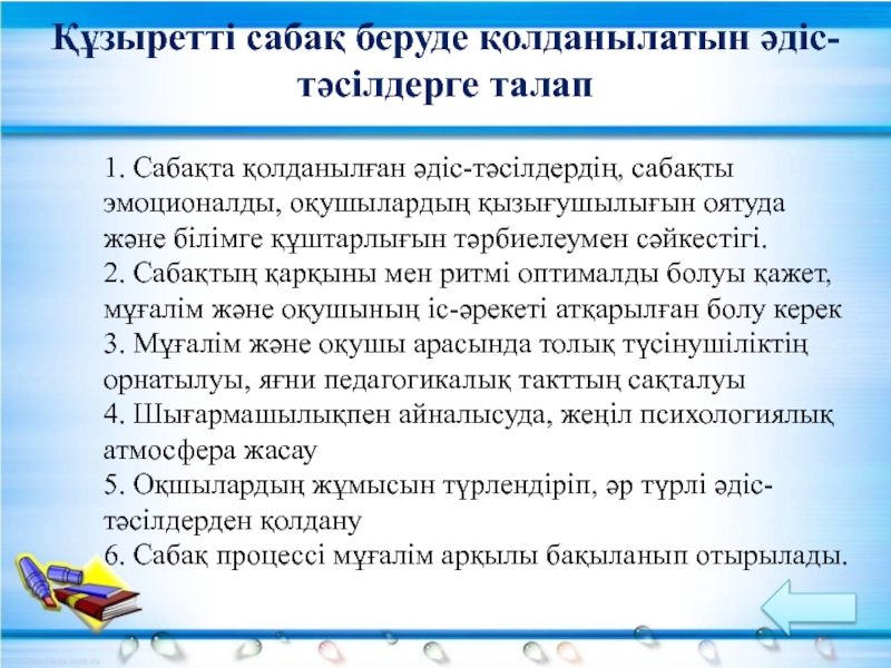Слайд 18Құзыретті сабақ беруде қолданылатын әдіс-тәсілдерге талап