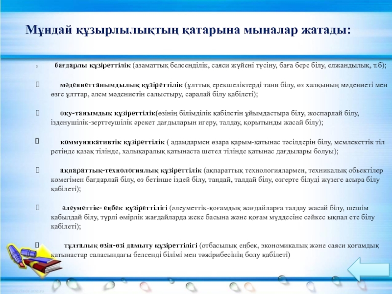 Слайд 6Мұндай құзырлылықтың қатарына мыналар жатады: