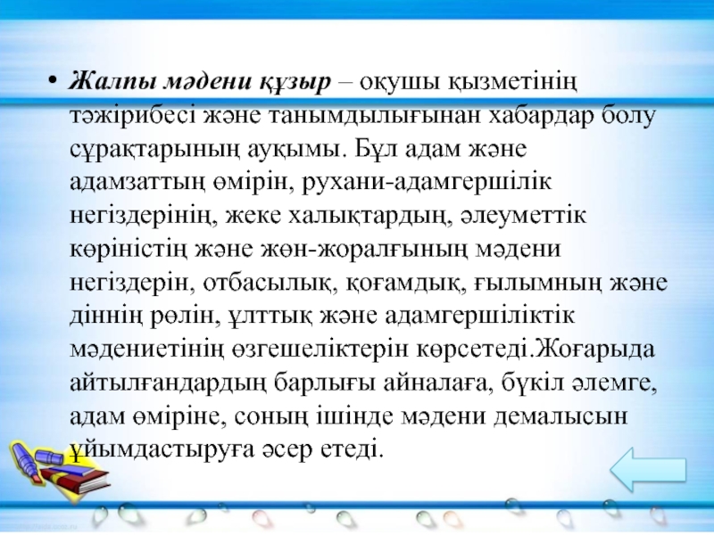 Слайд 12Жалпы мәдени құзыр – оқушы қызметінің тәжірибесі және танымдылығынан хабардар болу