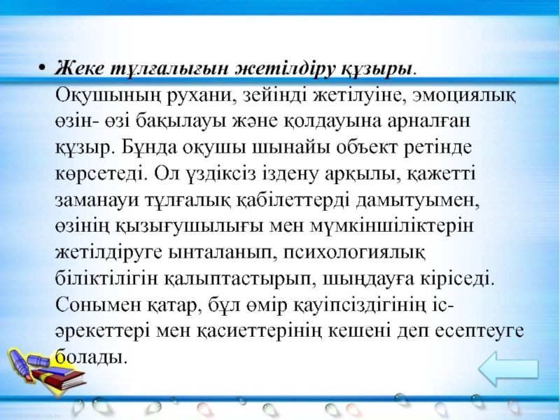 Слайд 13Жеке тұлғалығын жетілдіру құзыры. Оқушының рухани, зейінді жетілуіне, эмоциялық өзін- өзі