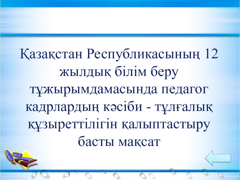 Слайд 2Қазақстан Республикасының 12 жылдық білім беру тұжырымдамасында педагог кадрлардың кәсіби -