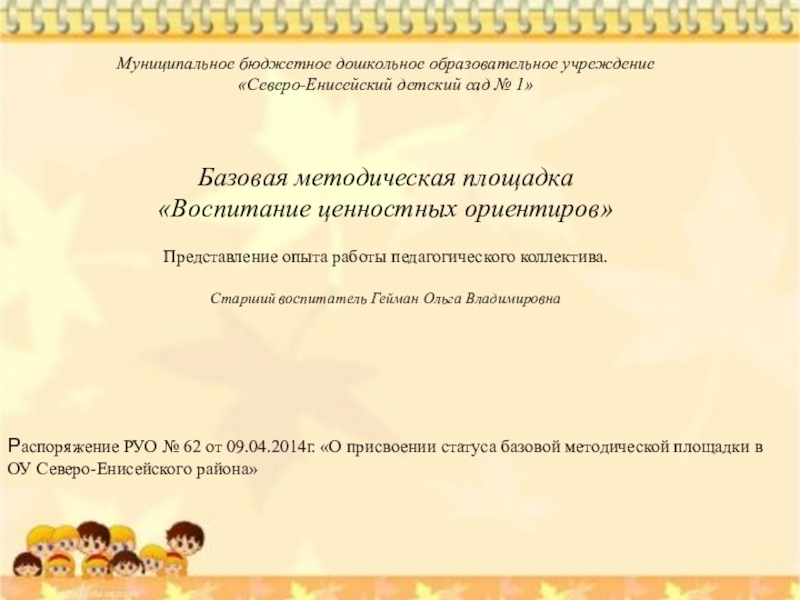 Распоряжение РУО № 62 от 09.04.2014г. «О присвоении статуса базовой методической площадки в ОУ Северо-Енисейского района»