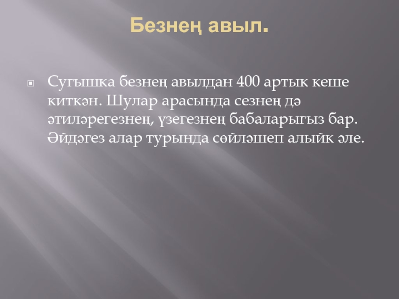 Безнең авыл. Сугышка безнең авылдан 400 артык кеше киткән. Шулар арасында сезнең дә әтиләрегезнең, үзегезнең бабаларыгыз бар.