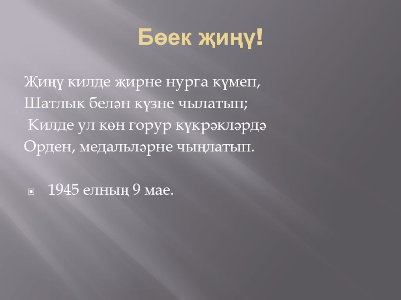 Бөек җиңү!Җиңү килде җирне нурга күмеп, Шатлык белән күзне чылатып; Килде ул көн горур күкрәкләрдә Орден, медальләрне