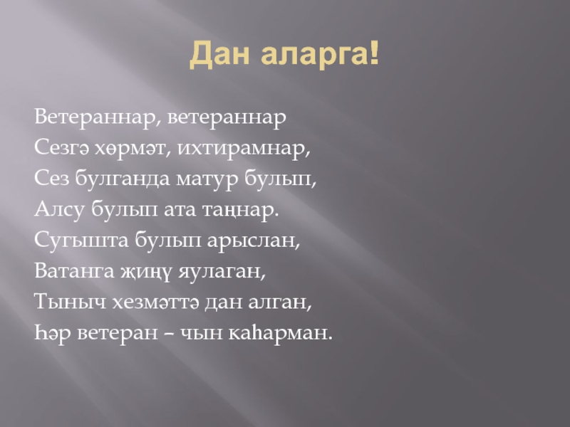 Дан аларга!Ветераннар, ветераннарСезгә хөрмәт, ихтирамнар,Сез булганда матур булып, Алсу булып ата таңнар.Сугышта булып арыслан,Ватанга җиңү яулаган,Тыныч хезмәттә
