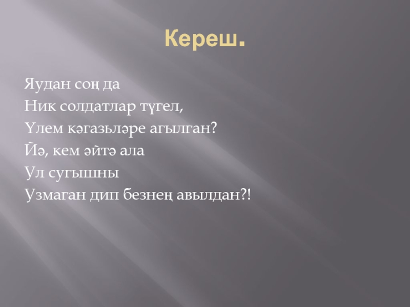 Кереш.Яудан соң даНик солдатлар түгел,Үлем кәгазьләре агылган?Йә, кем әйтә алаУл сугышныУзмаган дип безнең авылдан?!