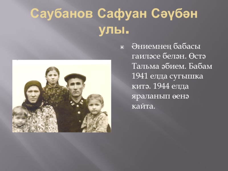 Саубанов Сафуан Сәүбән улы. Әниемнең бабасы гаиләсе белән. Өстә Тальма әбием. Бабам 1941 елда сугышка китә. 1944