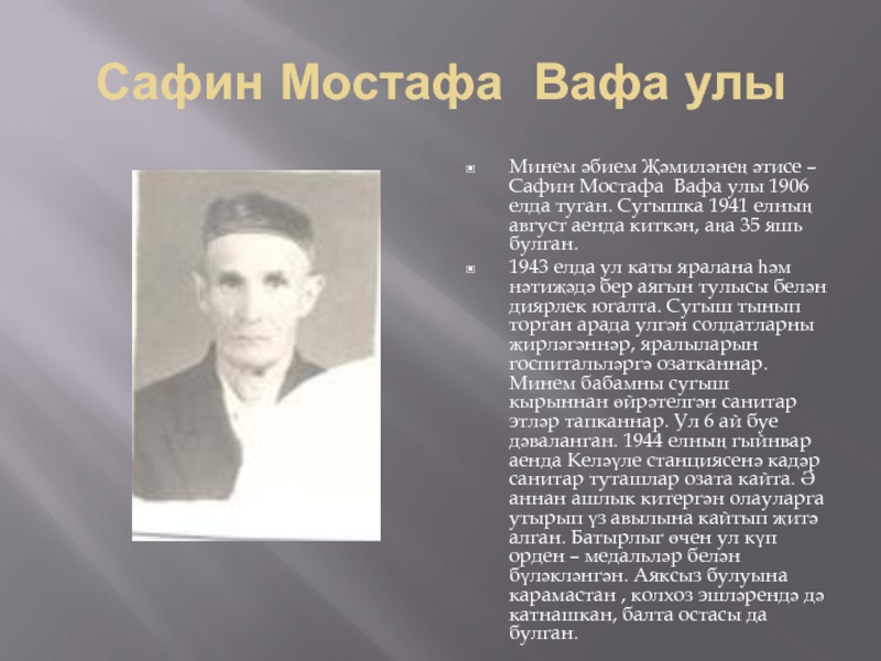 Сафин Мостафа Вафа улыМинем әбием Җәмиләнең әтисе – Сафин Мостафа Вафа улы 1906 елда туган. Сугышка 1941