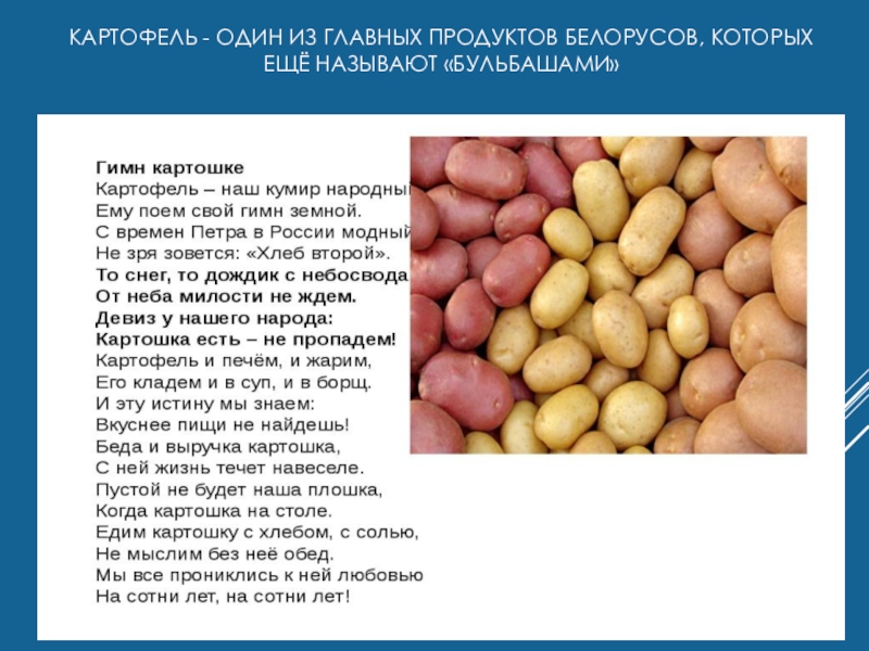 Слайд 8КАРТОФЕЛЬ - ОДИН ИЗ ГЛАВНЫХ ПРОДУКТОВ БЕЛОРУСОВ, КОТОРЫХ ЕЩЁ НАЗЫВАЮТ «БУЛЬБАШАМИ»
