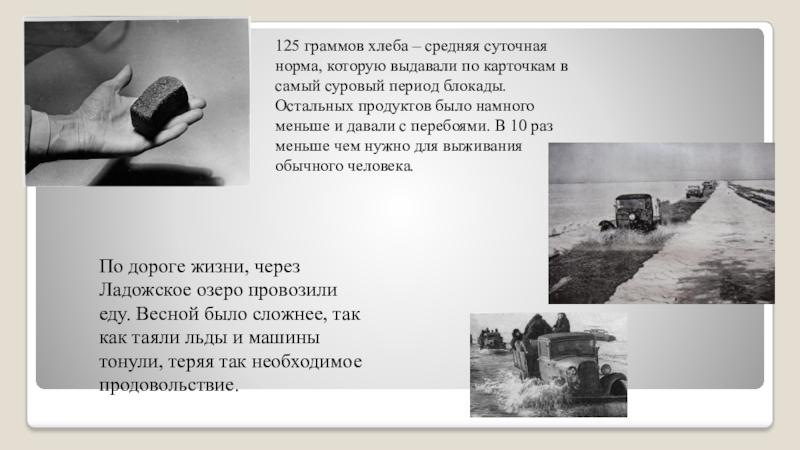 По дороге жизни, через Ладожское озеро провозили еду. Весной было сложнее, так как таяли льды и машины тонули, теряя так необходимое продовольствие.