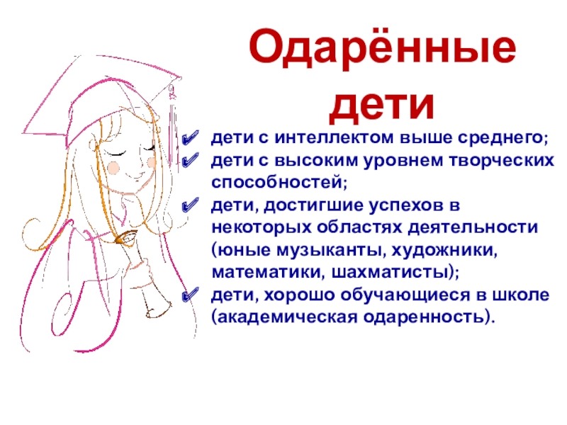 Одарённый ребенок — это ребенок, который выделяется яркими, очевидными, иногда выдающимися достижениями (или имеет внутренние предпосылки для таких достижений) в том или ином виде деятельности.