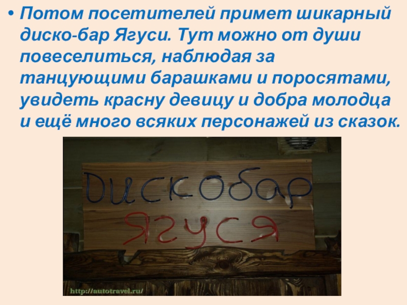 Слайд 40Потом посетителей примет шикарный диско-бар Ягуси. Тут можно от души повеселиться,
