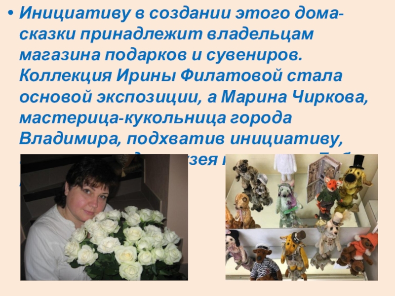 Коллекция Ирины Филатовой стала основой экспозиции, а Марина Чиркова, мастерица-кукольница города Владимира, подхватив инициативу, изготовила для музея несколько Бабок-Ёжек.