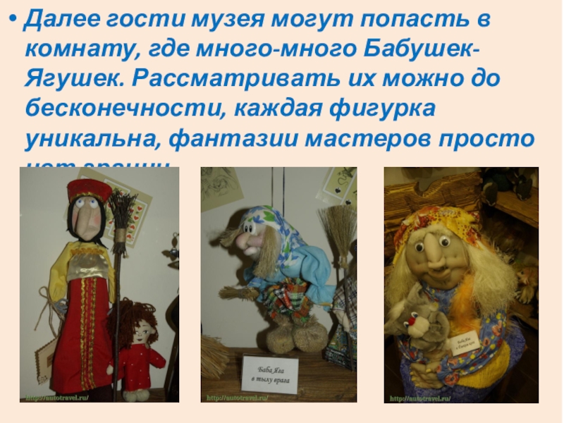 Слайд 30Далее гости музея могут попасть в комнату, где много-много Бабушек-Ягушек. Рассматривать