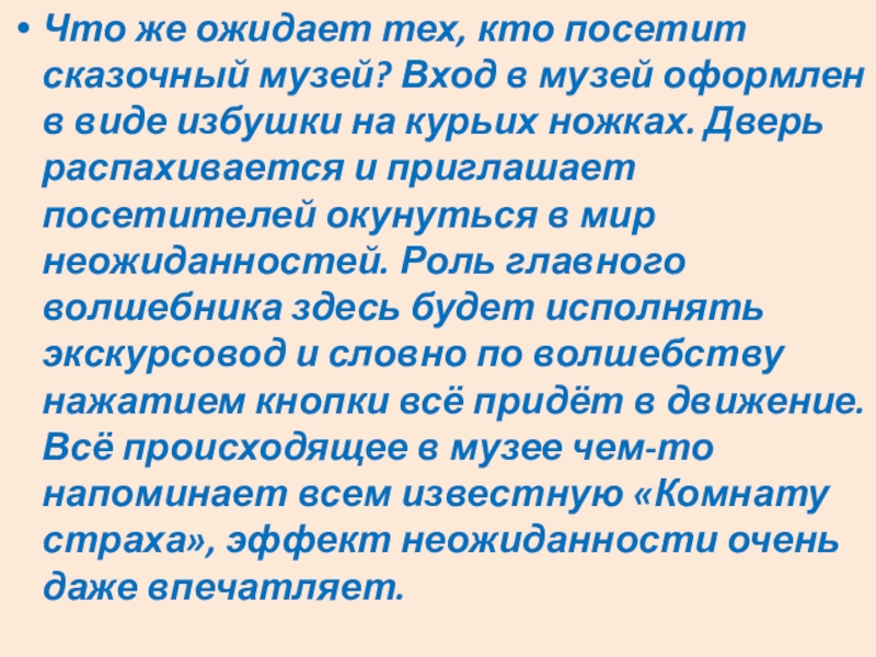 Слайд 20Что же ожидает тех, кто посетит сказочный музей? Вход в музей