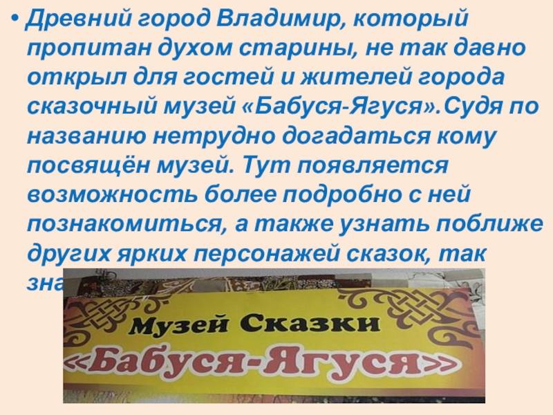 Слайд 15Древний город Владимир, который пропитан духом старины, не так давно открыл
