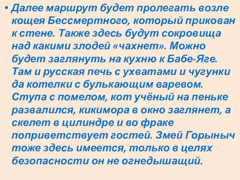 Слайд 24Далее маршрут будет пролегать возле кощея Бессмертного, который прикован к стене.