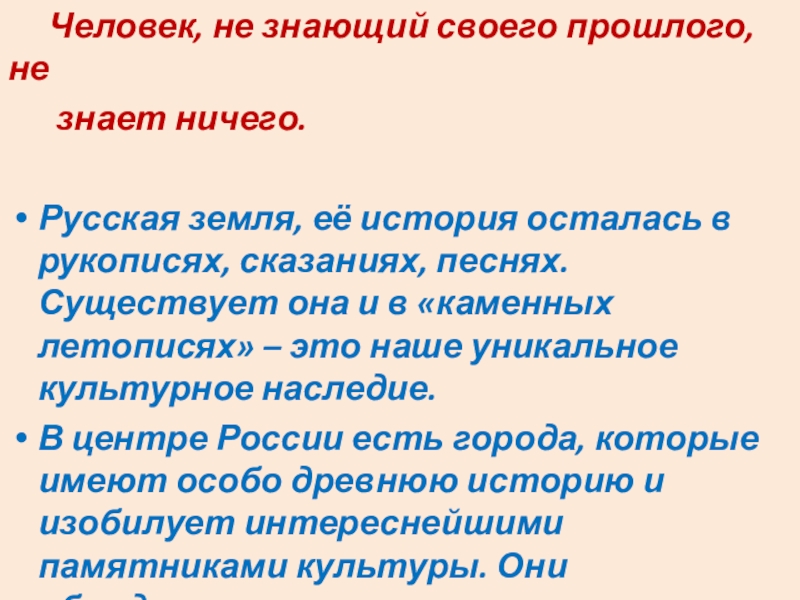 Русская земля, её история осталась в рукописях, сказаниях, песнях. Существует она и в «каменных летописях» – это наше уникальное культурное наследие.