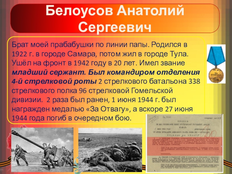 • изучил свою родословную, узнал о родственниках- ветеранах ВОВ и собрал информацию об их жизни и боевом пути;