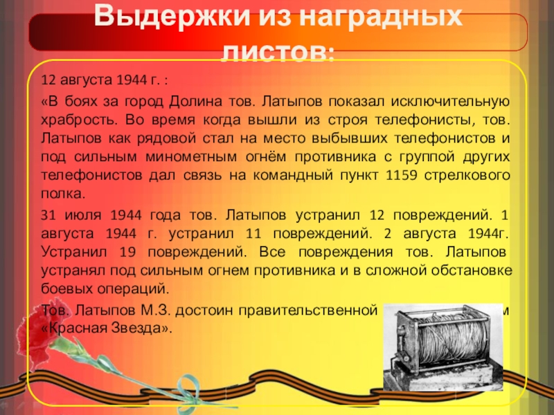 В ночном бою за село БЕРИН тов. Латыпов целую ночь находился на линии свзяи и несмотря на тёмную ночь устранил 10 повреждений, что дало возможность руководить ночным боем.