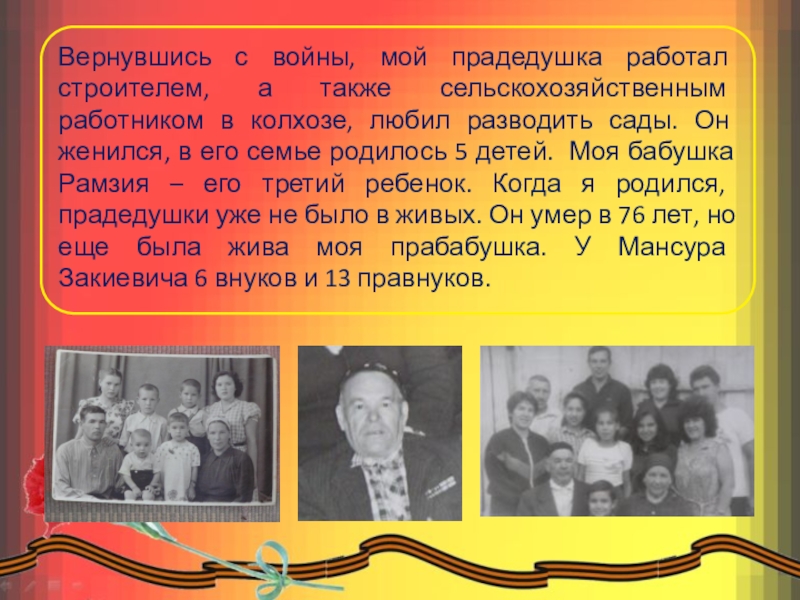 в колхозе, любил разводить сады. Он женился, в его семье родилось 5 детей. Моя бабушка Рамзия – его третий ребенок. Когда я родился, прадедушки уже не было в живых. Он умер в 76 лет, но еще была жива моя прабабушка. У Мансура Закиевича 6 внуков и 13 правнуков.