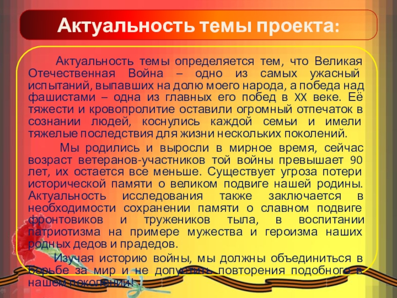 Мы родились и выросли в мирное время, сейчас возраст ветеранов-участников той войны превышает 90 лет, их остается все меньше. Существует угроза потери исторической памяти о великом подвиге нашей родины. Актуальность исследования также заключается в необходимости сохранении памяти о славном подвиге фронтовиков и тружеников тыла, в воспитании патриотизма на примере мужества и героизма наших родных дедов и прадедов.